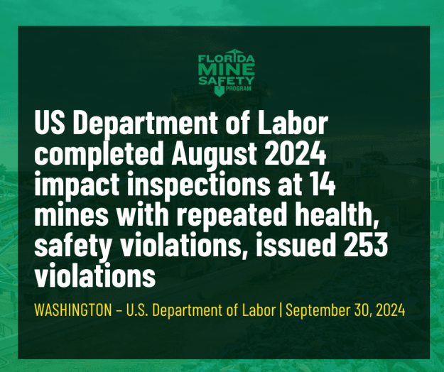 WASHINGTON – The U.S. Department of Labor announced today that its Mine Safety and Health Administration completed impact inspections at 14 mines in 10 states in August 2024, issuing 253 violations. The agency began conducting impact inspections after an April 2010 explosion in West Virginia at the Upper Big Branch Mine killed 29 miners. Since 2023, MSHA’s impact…